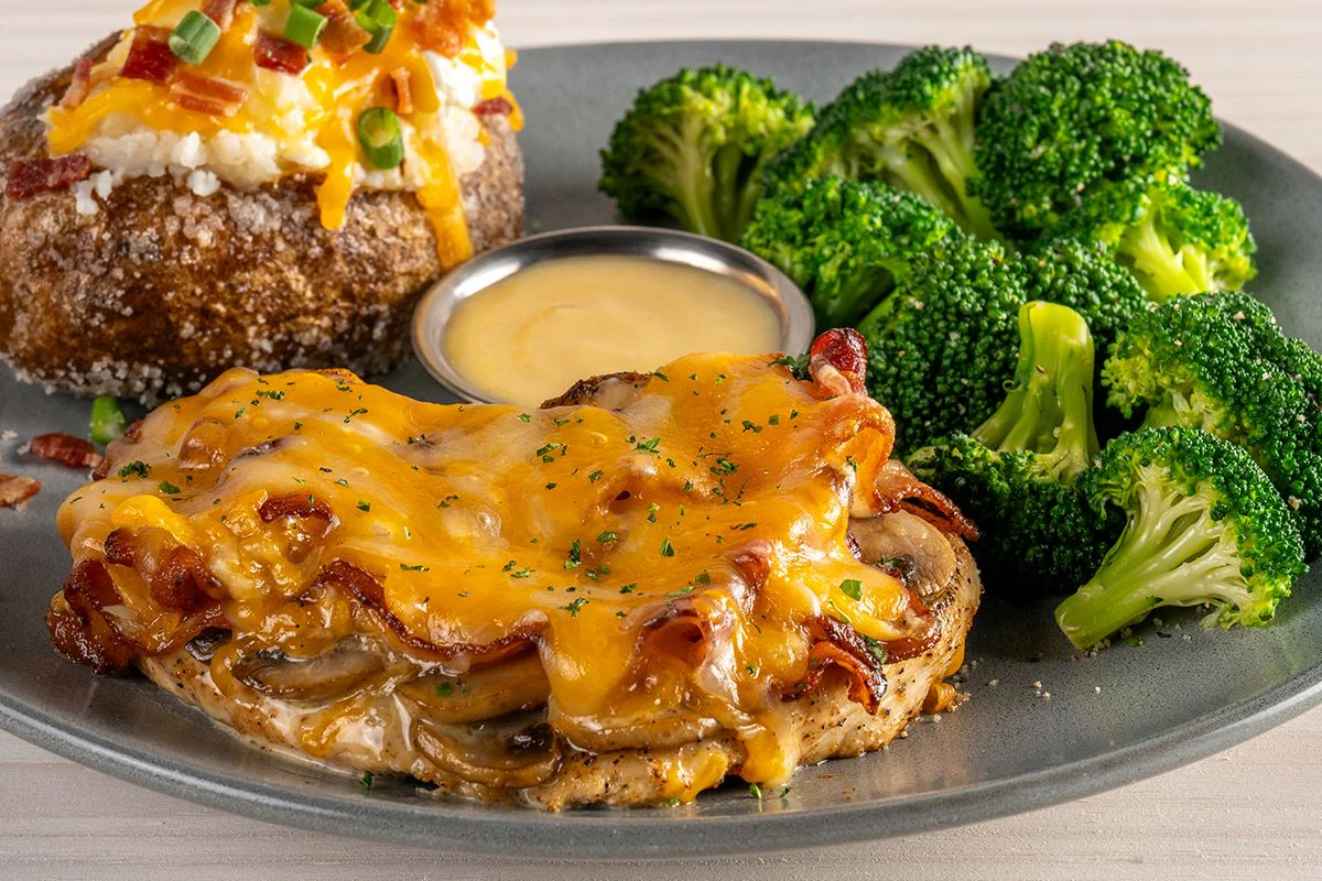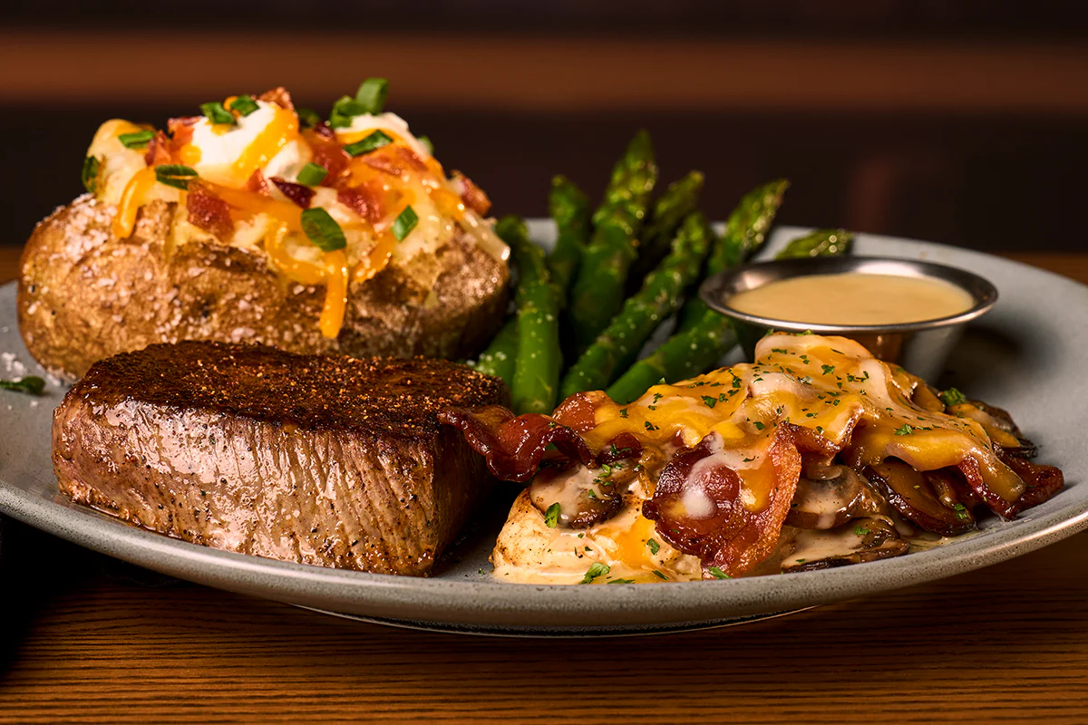 Signature center-cut sirloin and 5 oz. grilled chicken breast topped with sautéed mushrooms, crisp bacon, Monterey Jack and Cheddar cheese and honey mustard.