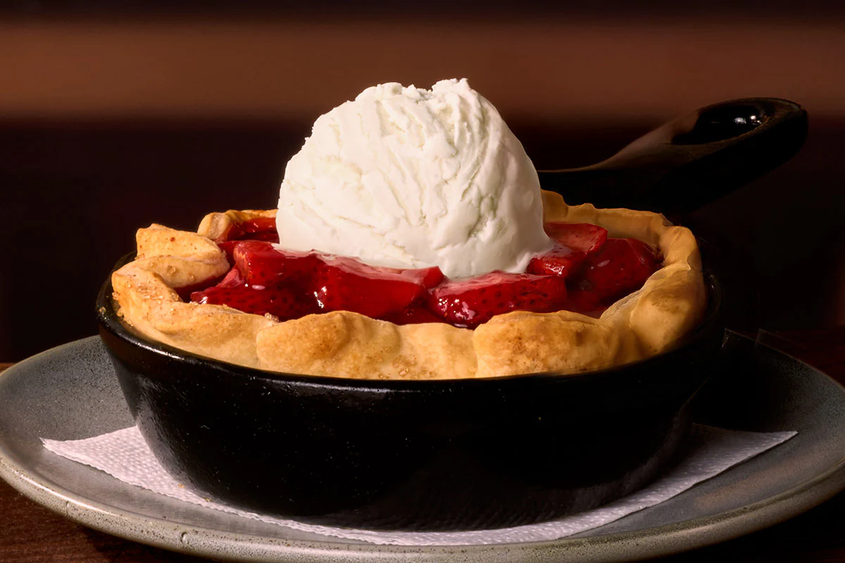 A golden, buttery crust filled with juicy strawberries, baked to perfection in a skillet. topped with vanilla ice cream.