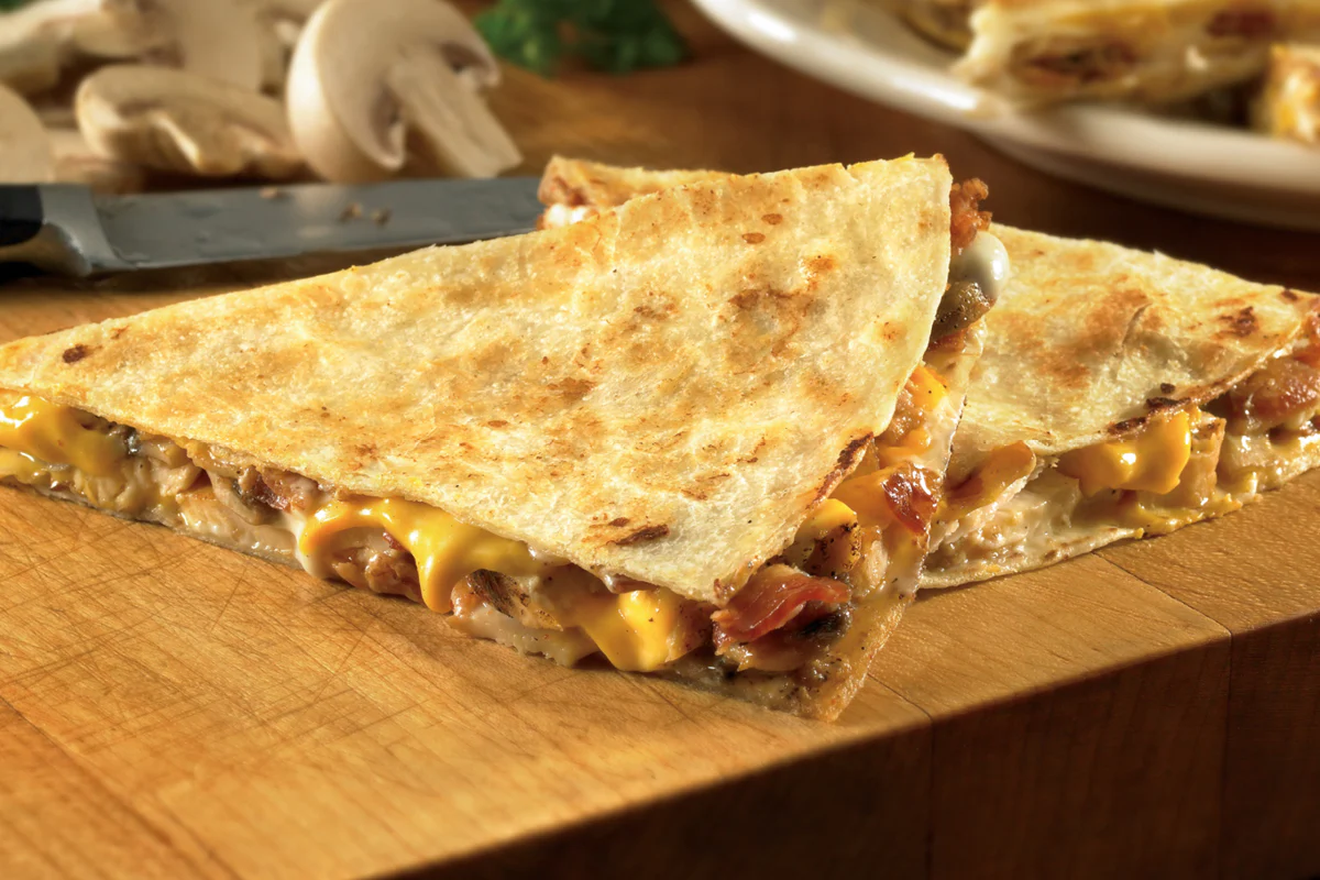 two flour tortillas loaded with grilled chicken breast, sautéed mushrooms, crisp bacon, melted Monterey Jack and Cheddar cheeses, and honey mustard sauce. Served with honey mustard