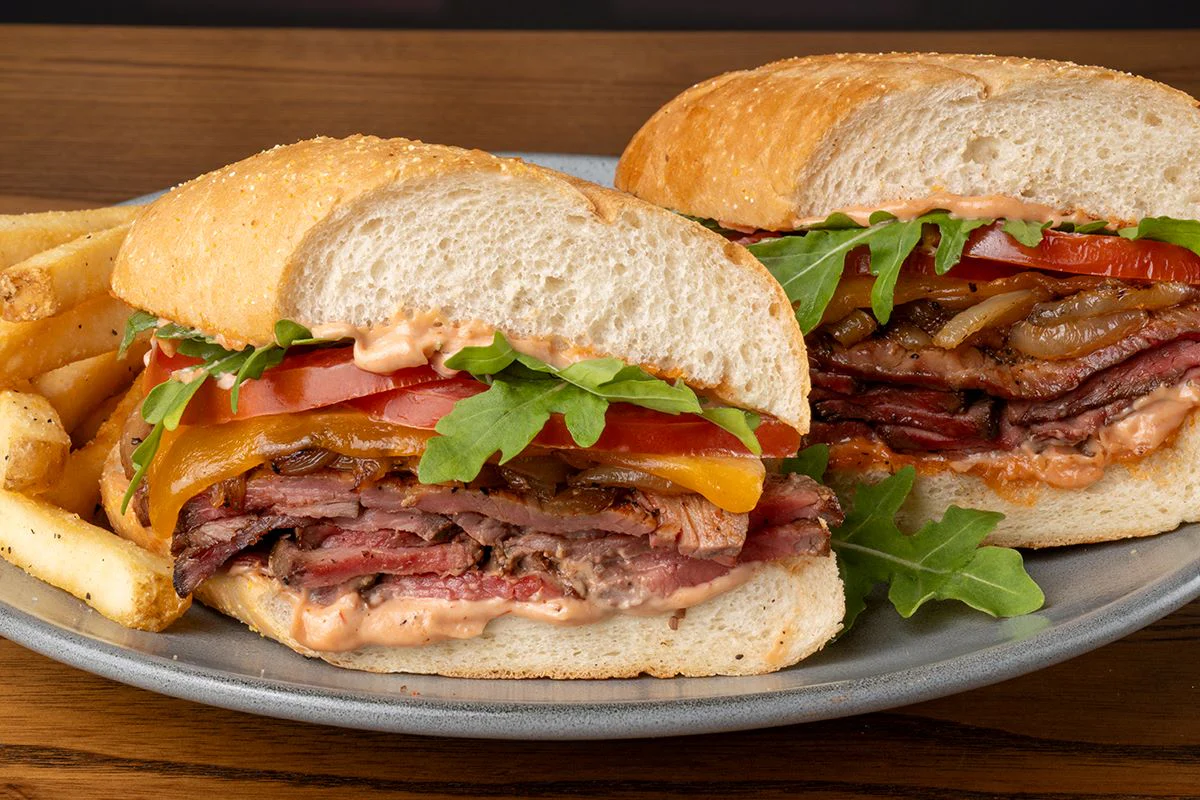 Seared and sliced sirloin, aged Cheddar, grilled onions, sliced tomato, arugula, and tomato aioli on a toasted baguette. Served with a freshly made side. Available until 4 pm.